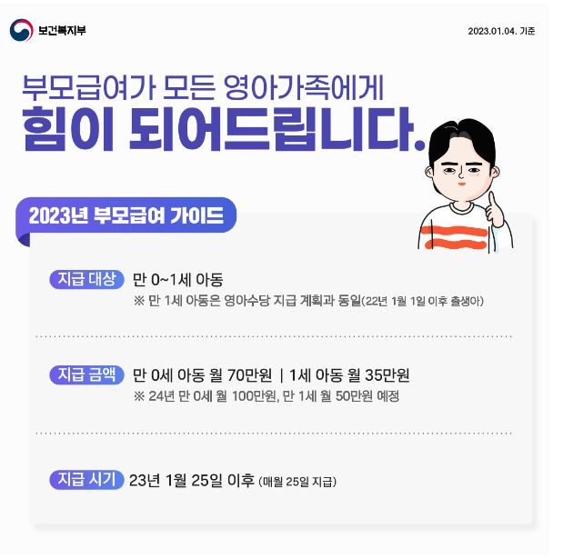 보건복지부는 새해부터 부모급여가 지급되면 부모들에게는 경제적으로 큰 도움이, 아동에게는 건강한 출발점을 마련해 주는데 기여할 수 있을 것이라고 부모급여 기대효과를 강조했습니다.