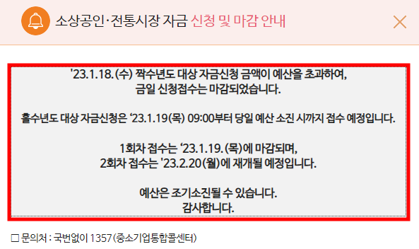 오늘 예산분도 조기 마감 되었다고 공지가 나왔습니다. 1회 차 자금은 내일 출생년도 끝자리 홀수대표님까지 신청받고 마감한다고 하니 내일 해당하시는 분들은 설 연휴 전에 신청할 수 있는 마지막기회이니 꼭 신청하시길 바랍니다.