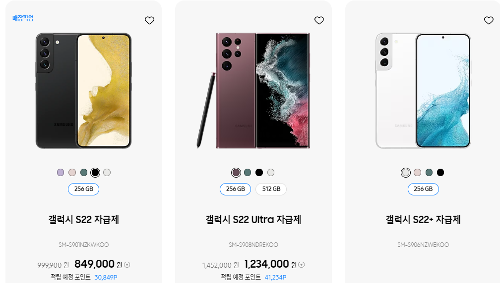 갤럭시 s22 색상 - 보라 퍼플, 핑크 골드, 그린, 팬텀 블랙, 팬텀 화이트