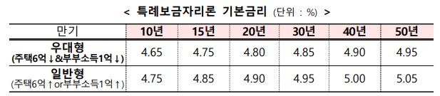 만기 10년 ~ 50년까지 5년 단위로 선택가능하며 상환기간에 따라 금리가 차등적용 됩니다.
