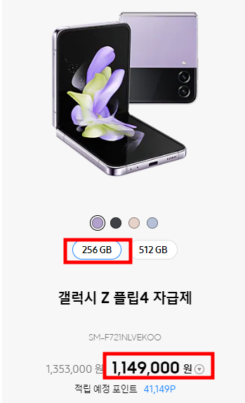 지난 8월 26일 갤럭시z플립4 정식 출고 되었습니다. 갤럭시z플립4 출고가격은 256GB 1,353,000원 512GB 1,474,000원 이었으나 현재는 256GB 1,149,000원, 512GB 1,249,000원으로 인하된 가격에 구입할 수 있습니다.