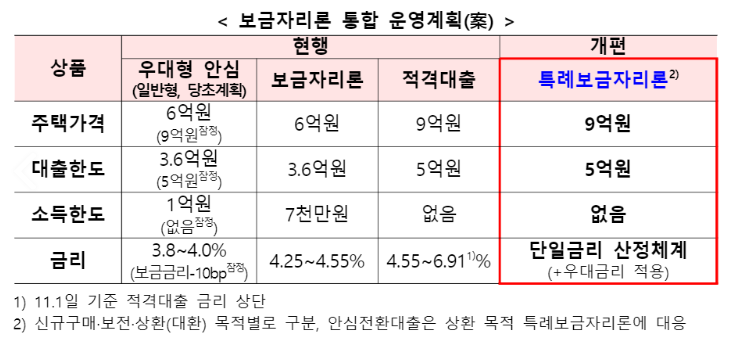 정부는 시장금리 상승으로 가계부채 상환부담이 크게 늘어나고 있는 상황에서 보다 많은 차주의 금리부담 경감을 위해 2023년 한시적으로 1년간 안심전환대출과 적격대출을 보금자리론에 통합하여 특례보금자리론으로 운영할 계획을 밝혔습니다.