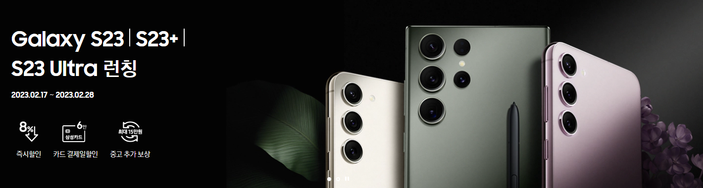삼성닷컴에는 2월 17일 ~ 2월 28일 까지 갤럭시 S23 구입 시 8% 즉시할인, 삼성카드 6% 청구할인, 중고추가보상 구매혜택이 진행되고 있습니다.