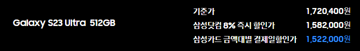 삼성닷컴 구입 혜택을 받을 경우 갤럭시 S23 울트라 512GB 구입시 할인혜택을 받게 되면 1,724,000원 → 1,522,000원에 구입이 가능합니다.