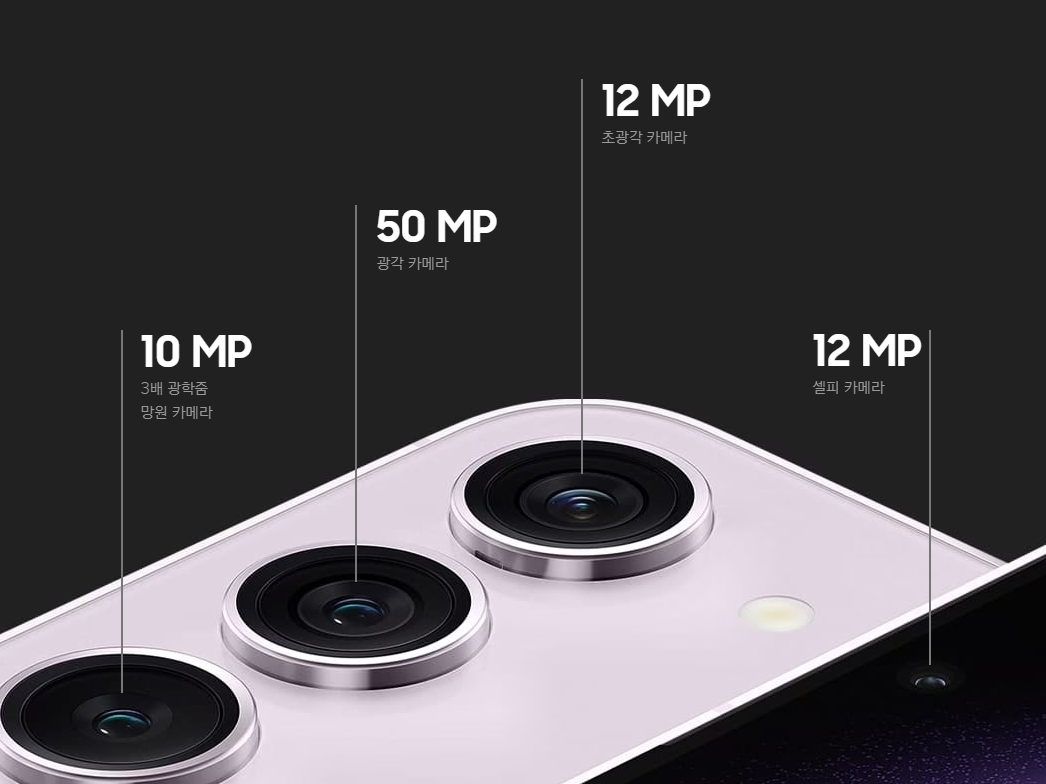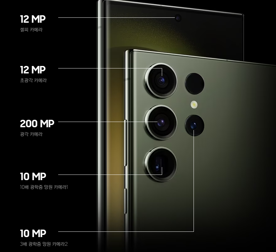 ■ 갤럭시 s23 울트라에는 1200만 화소 셀피카메라, 1200만 화소 초광각 카메라, 1000만 10배 광학줌 망원 카메라와 1000만 3배 광학줌, 2억 화소 메인 후면 광각 카메라로 5개의 카메라가 탑재되었습니다.
