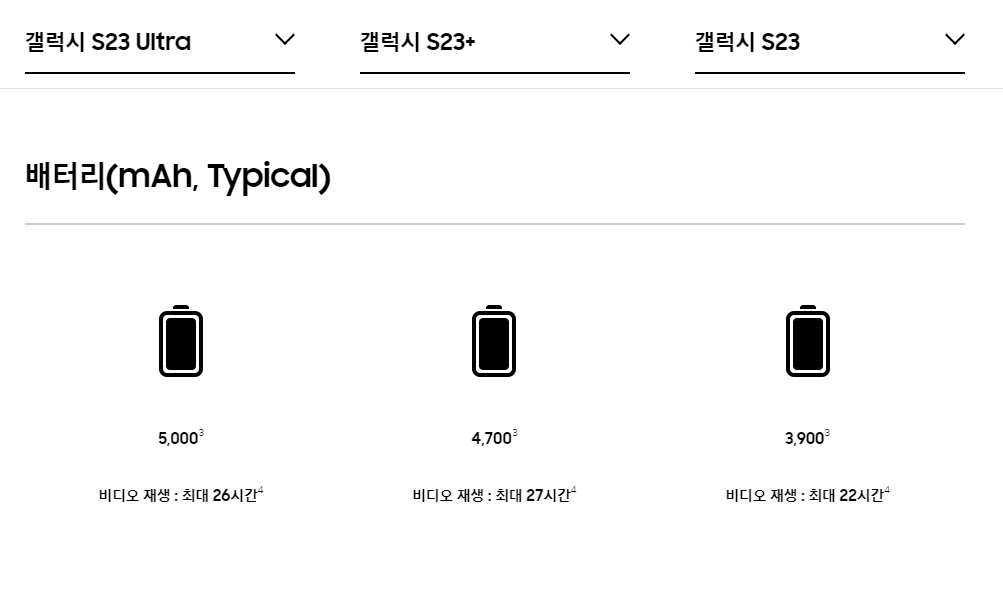갤럭시 s23 , 갤럭시 s23 플러스는 전작대비 200mAh 용량이 증가했고, 갤럭시 s23 울트라는 전작과 동일한 5000mAh 배터리 용량이 적용되었습니다.