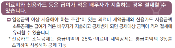 의료비 항목은 나이,소득요건을 보지 않습니다. 맞벌이 부부로 소득요건에 맞지 않은 배우자 의료비도 상대방에게 몰아줄 수 있습니다.