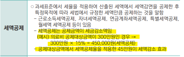 ■세액공제 - 내야할 세금을 직접 깎아주는 제도로 소득에 상관없이 연말정산을 하는 사람들이라면 같은 조건,항목에서 동일하게 적용하여 세금을 줄여주는 방법입니다.